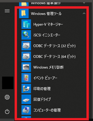 表示されたメニューの中に『Windows 管理ツール』があるので、利用したい機能をクリックすることで、『Windows 管理ツール』内の機能を直接起動します。