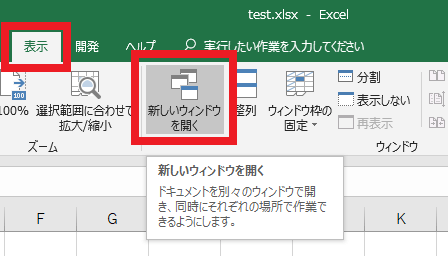 『新しいウィンドウを開く』機能は、Excelの画面上部にある『表示』タブをクリック。