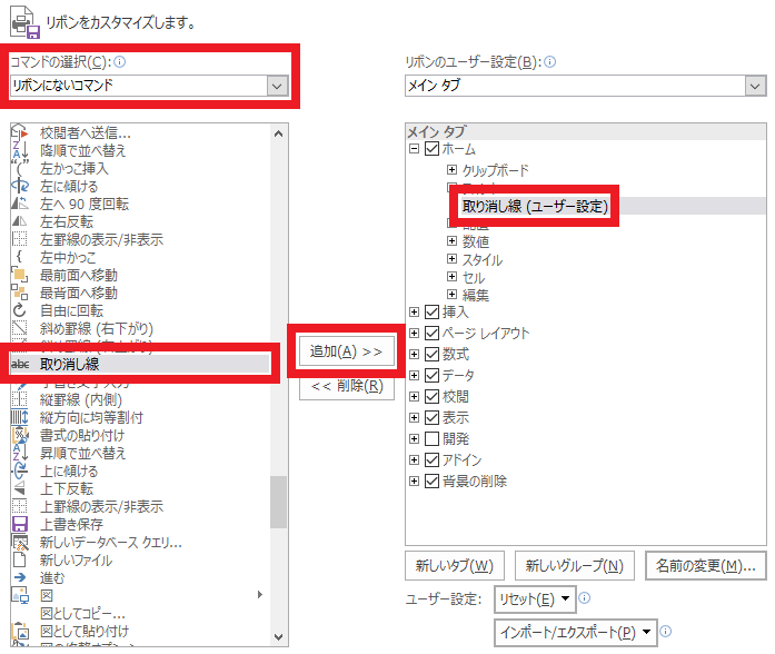 Excelで取り消し線(打ち消し線)を使用する方法やリボンへのボタンの追加方法