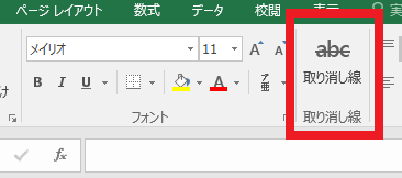 冒頭にも書いたとおり初期設定状態のExcelでは、画面上部のリボンの『フォント』グループには、『取り消し線』ボタンが表示されていません。
