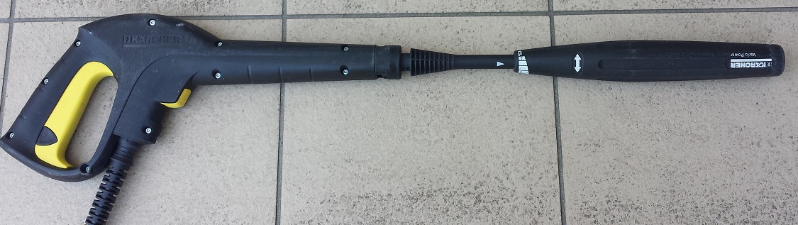 高圧洗浄機は電気でモーターを動かしてポンプを稼働させ、高圧の水を作り、それを極端に細い、それこそ針のように小さい穴から出すことにより、ものすごい勢いの水を噴出させて掃除を行う機械。